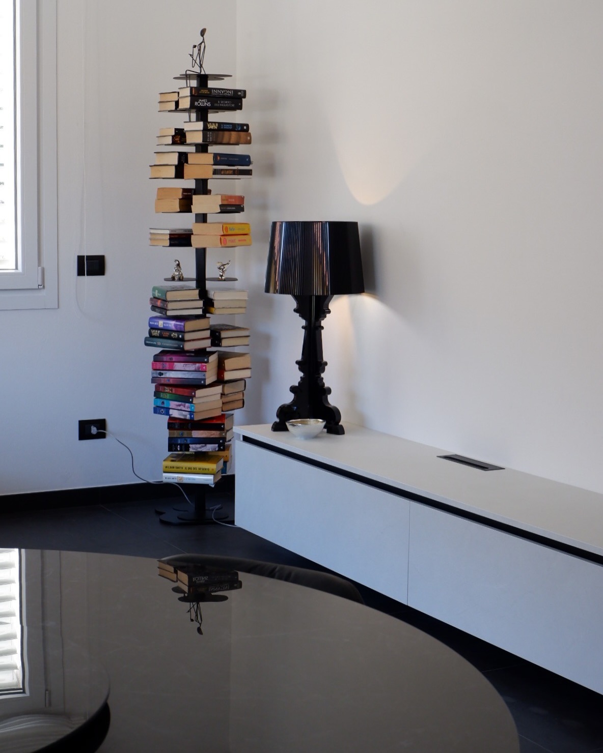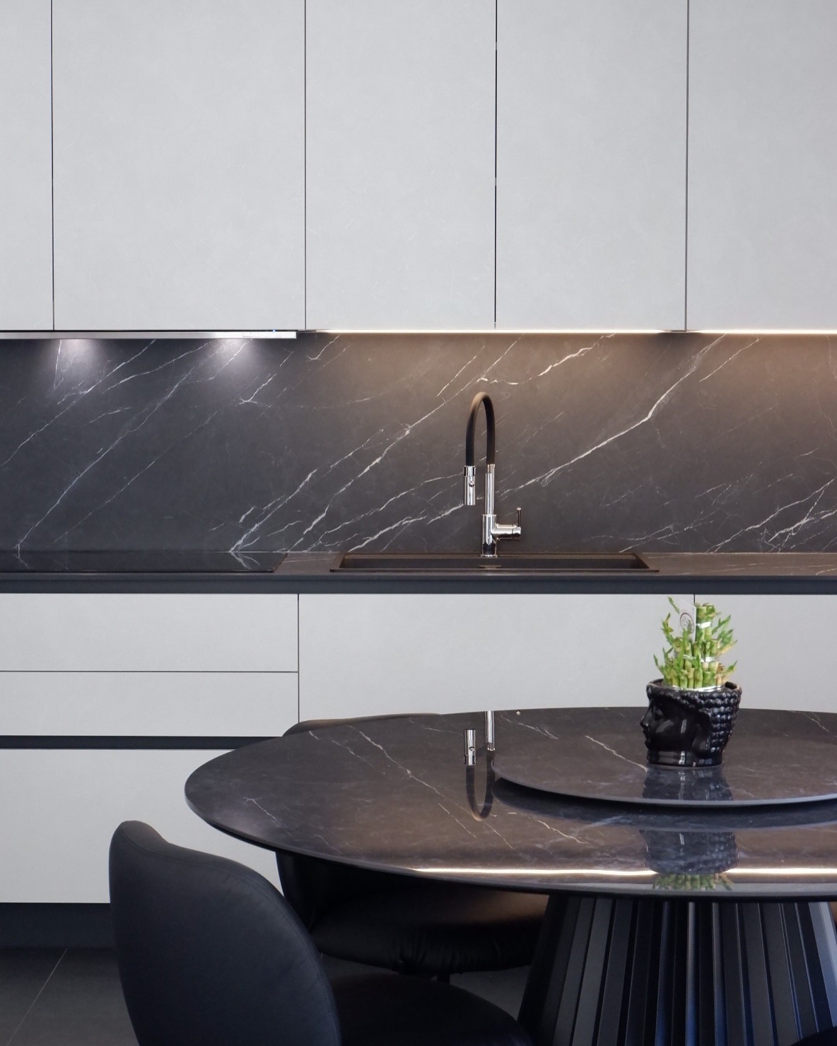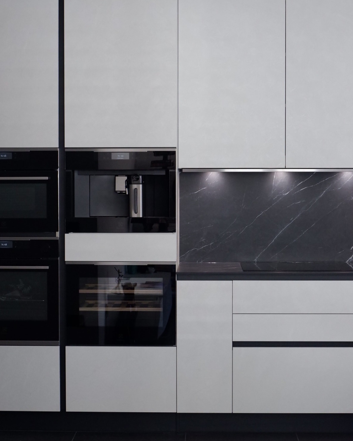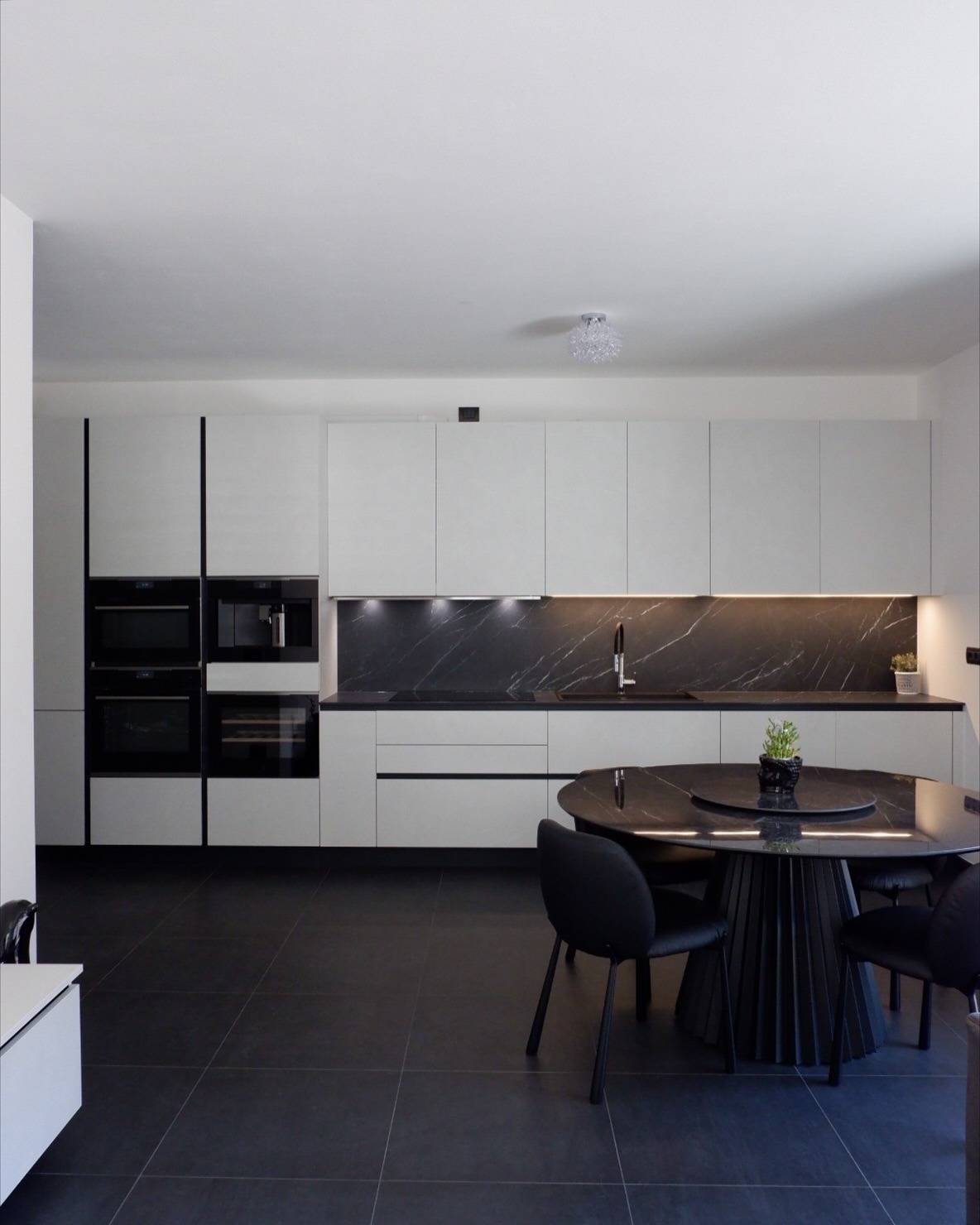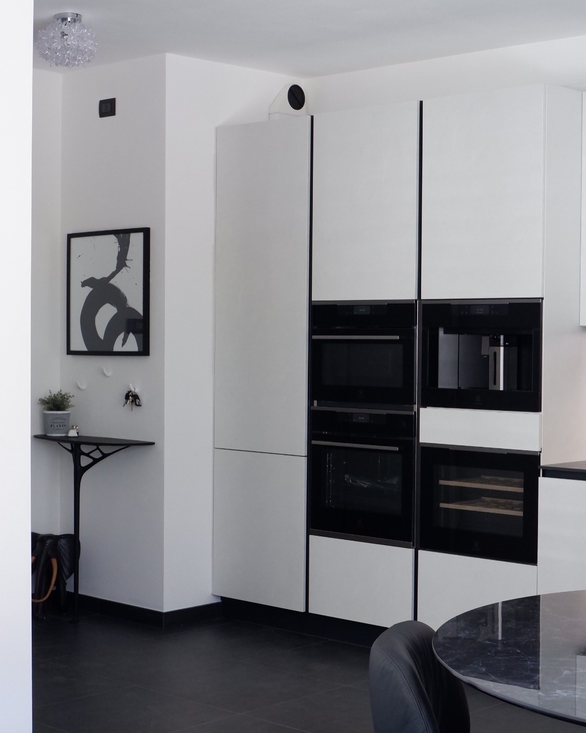 Un ambiente Veneta Cucine disegnato interamente su misura e progettato per avere tanto spazio di lavoro, tanta luce e sfruttare al massimo gli elettrodomestici, mantenendo gli stessi colori e le stesse finiture. Con il modello Start Time.J abbiamo sviluppato una cucina lineare, con top e schienali in ceramica spessore 1,2 cm. Gli elettrodomestici sono di Electrolux con macchina del caffè, cantina per vini, microonde e forno 100% vapore. La zona soggiorno è stata disegnata con gli stessi materiali e colori della cucina. La lampada “Bourgie” , la consolle di ingresso “A.I.” e le lampade a soffitto “Bloom” sono di Kartell. Tavolo e sedie sono di MIDJ.