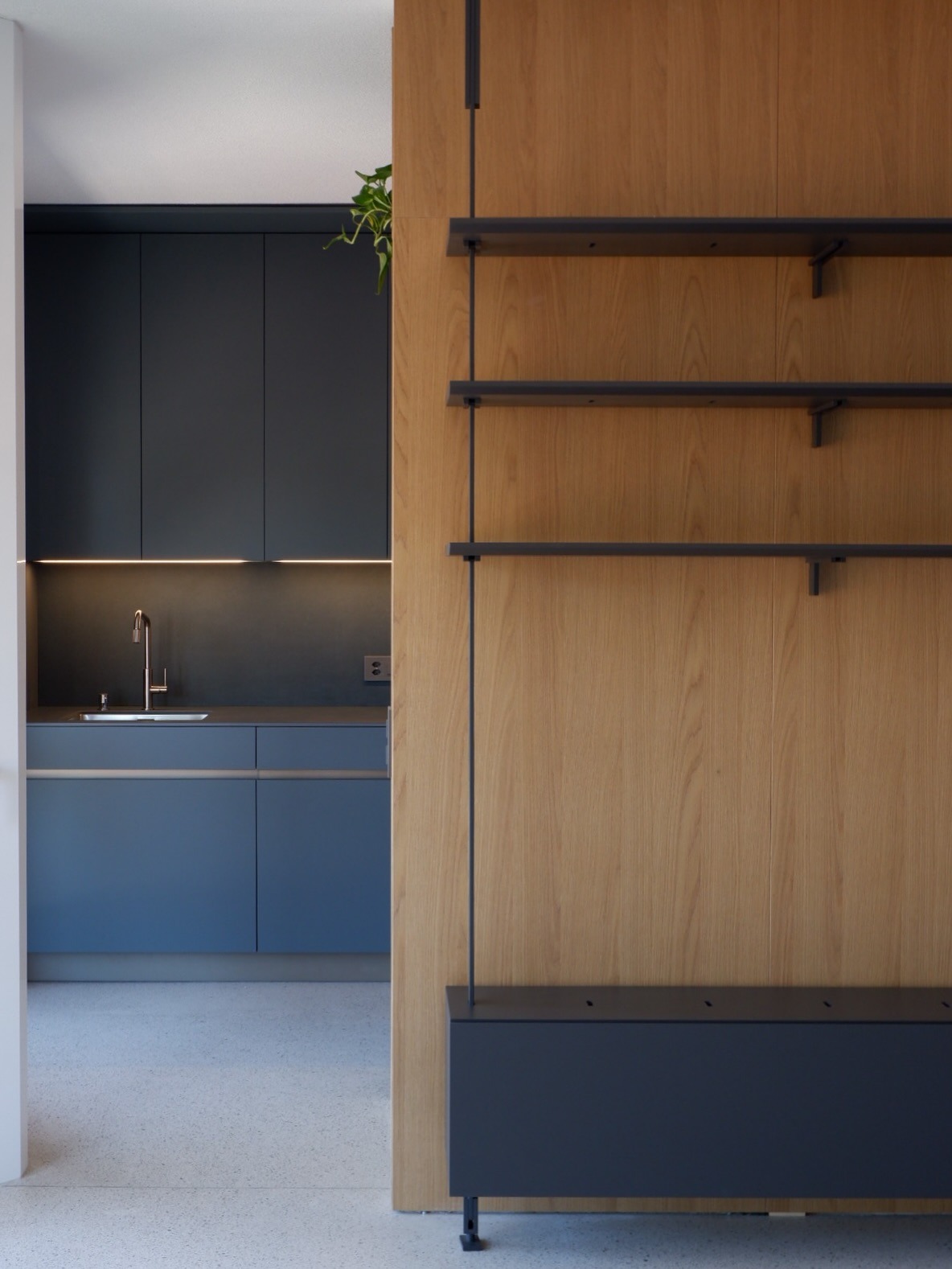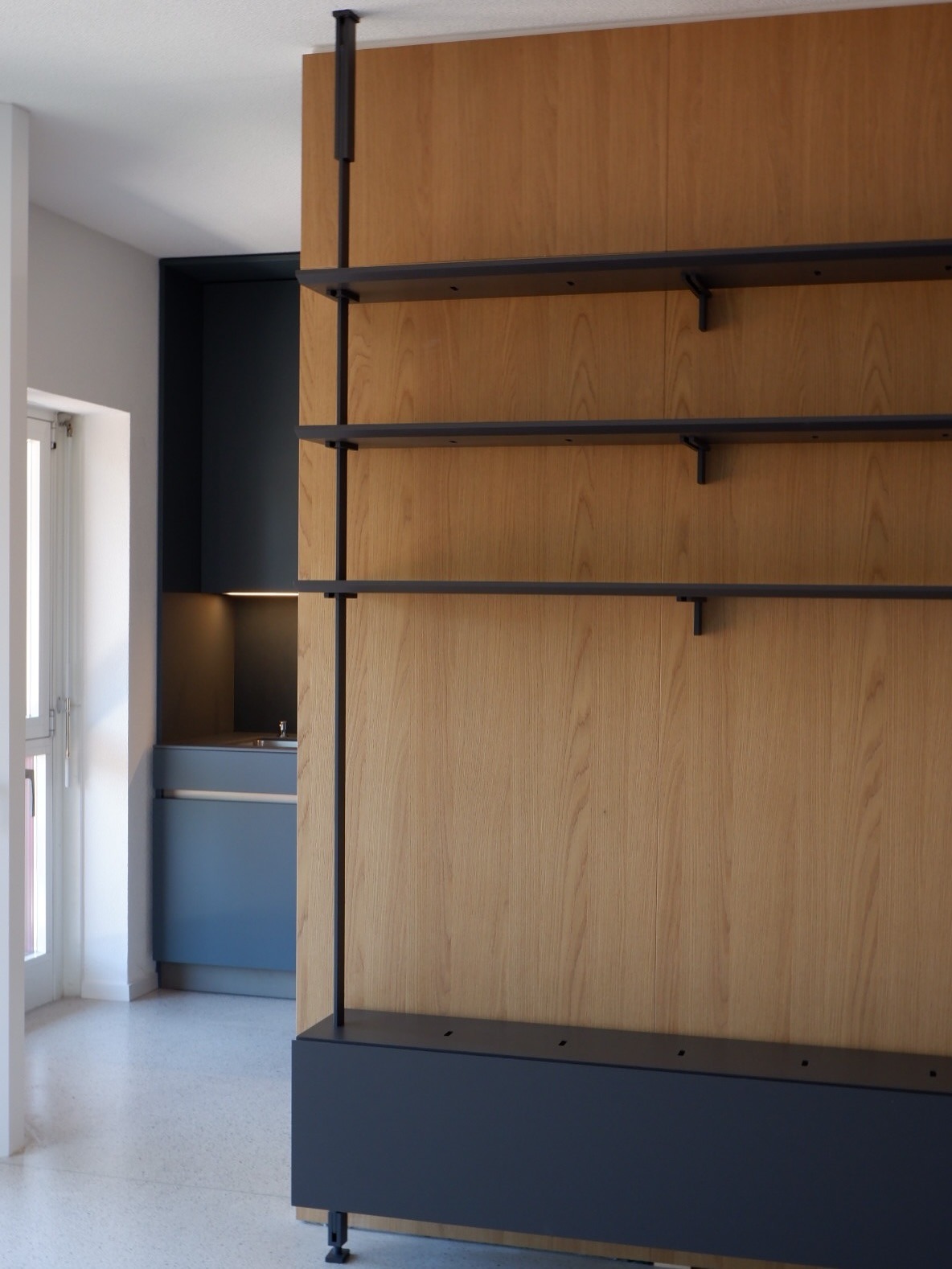 Il miscelatore è di Foster Group. La parte delle colonne è stata progettata per letteralmente avvolgere il muro divisorio tra cucina e soggiorno. Da un lato le colonne creano una nicchia di lavoro blu, con microonde e forno. Dall’altro invece la boiserie ricopre interamente la parete. Sul lato del soggiorno è stata inserita la libreria Airport di Cattelan Italia.