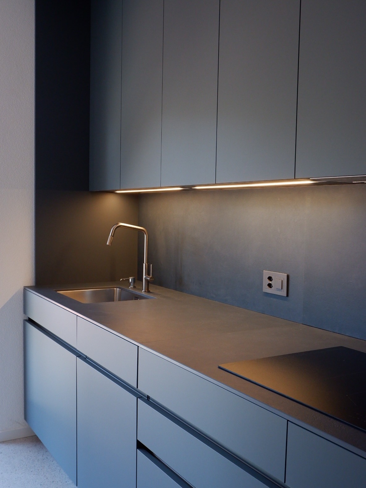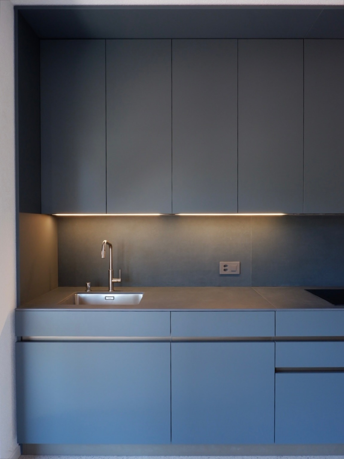 Il piano di lavoro è in ceramica Caranto Deep Blu spessore 1,2 centimetri, della stessa tinta delle ante, ed è profondo 75 centimetri.