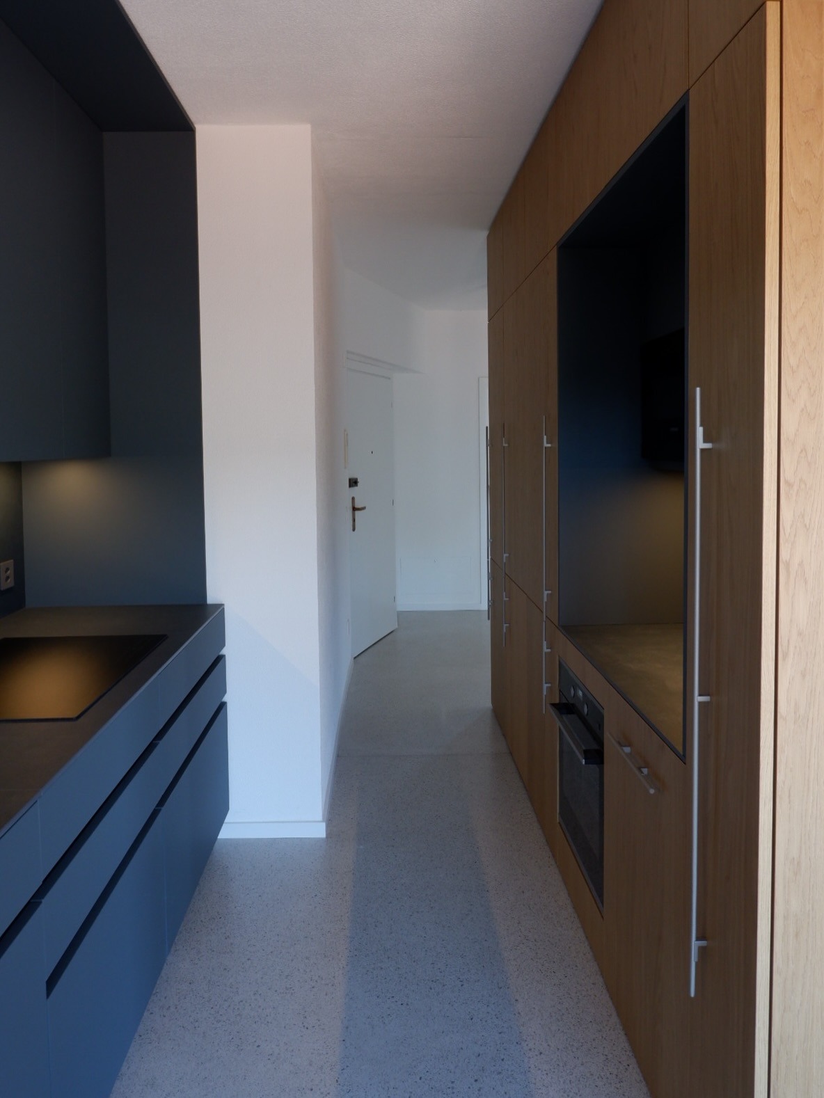 Solamente due finiture: colonne e boiserie in legno Rovere Ikebana e parete cucina in Laccato Soft Denim Blu.