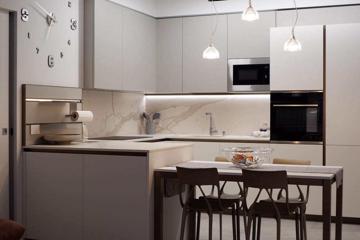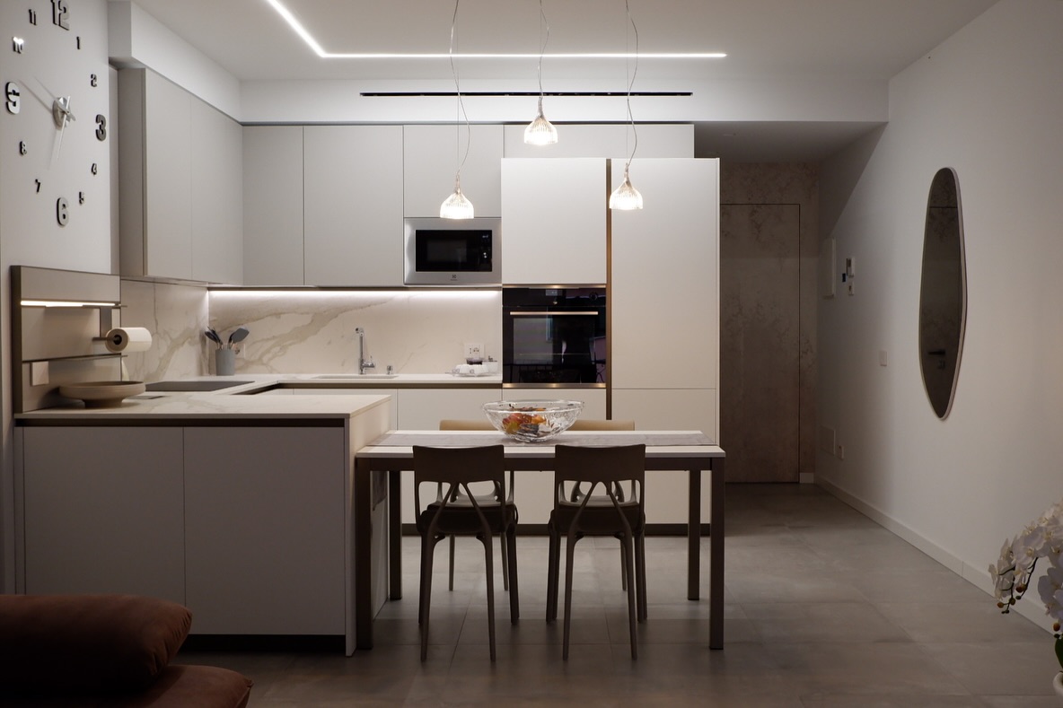 A completare l’ambiente: elettrodomestici Electrolux  con piano cottura in vetro opaco e forno a vapore e i dettagli di design firmati Kartell con le nuove sedie AI Light e le lampade É.